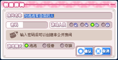 玩家点击房间列表窗口上方的“创建房间”按钮,可弹出如左窗口;在此玩家可以自己创建新的游戏房间,等待其他玩家加入。 创建房间时玩家可以对房间进行一系列的设置: 游戏方式; 人数。 |